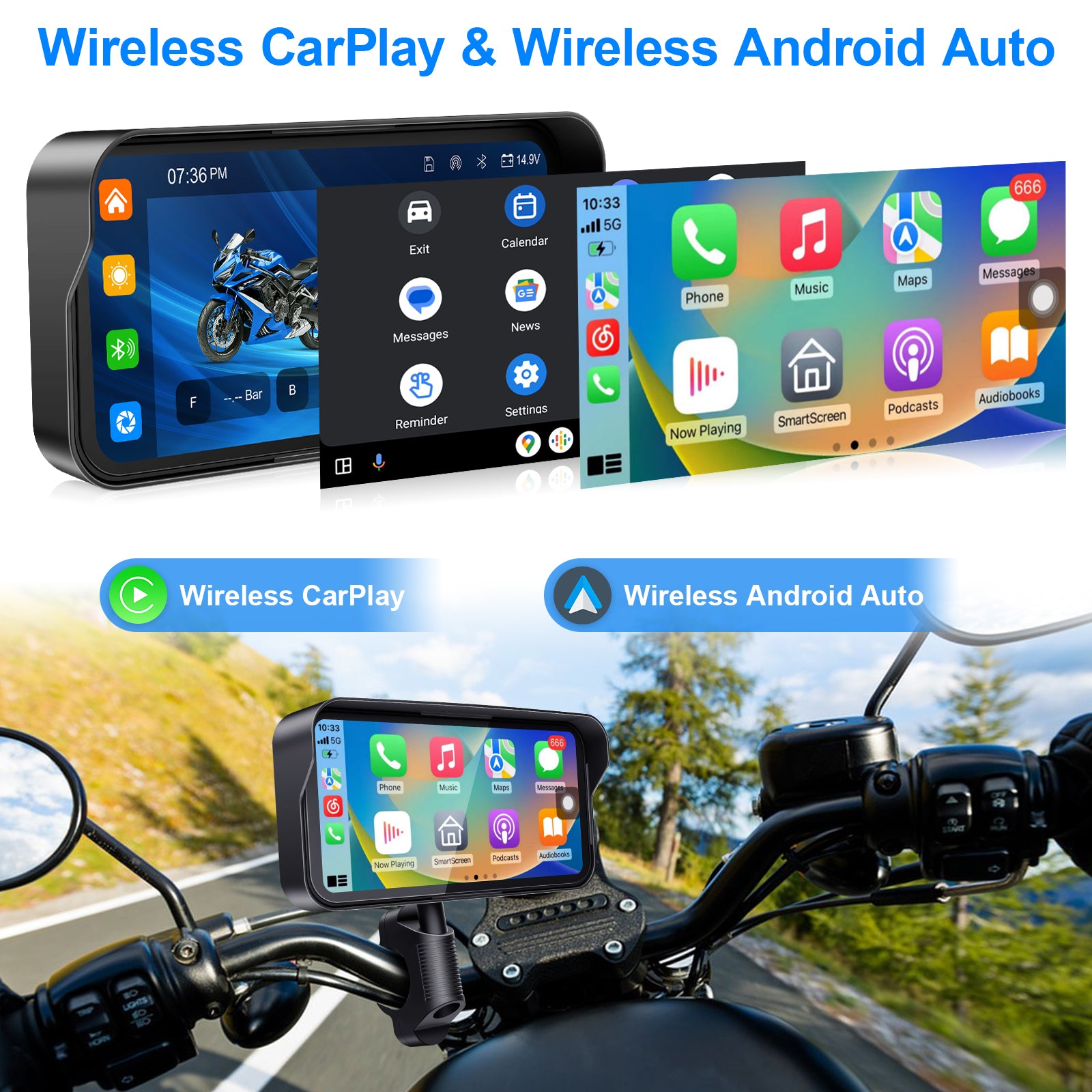 - 【Wireless CarPlay and Android Auto for Motorcycles】Bid farewell to distractions and keep your eyes on the road. Connect your phone wirelessly through CarPlay or Android Auto. This seamless connection lets you access key phone functions like calls, navigation, and music playback directly from the screen. With support for Google and Siri voice control, you can operate everything without taking your hands off the handlebars.