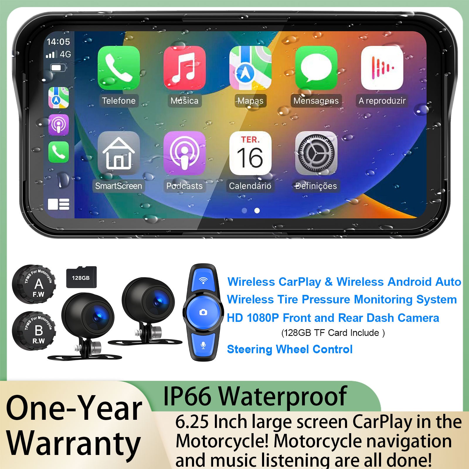 - 【Wireless Motorcycle CarPlay and Android Auto】Weuaste 6.25 inch motorcycle dash cam waterproof touchscreen has CarPlay or Android Auto functionality. By wirelessly connecting your smartphone to your motorcycle's touchscreen via Bluetooth, you can access map navigation, phone calls, music playback, text messaging, and more with the help of Siri or Google Assistant. Keeping your hands free allows you to focus on the road and ride safely.