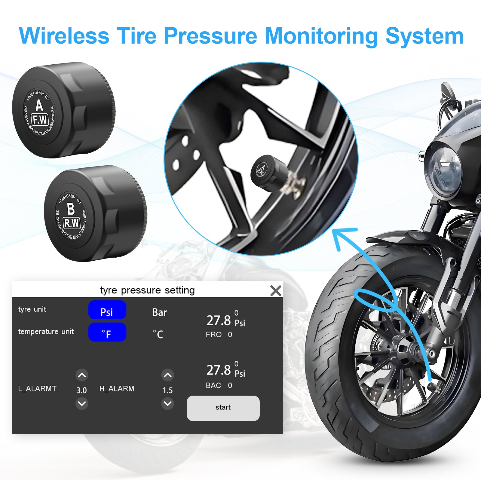 - 【Motorcycle TPMS】Motorcycle tire pressure monitoring system, includes 2 PCS tire sensors for real-time pressure and temperature Monitoring, keeping your rides safe and informed.