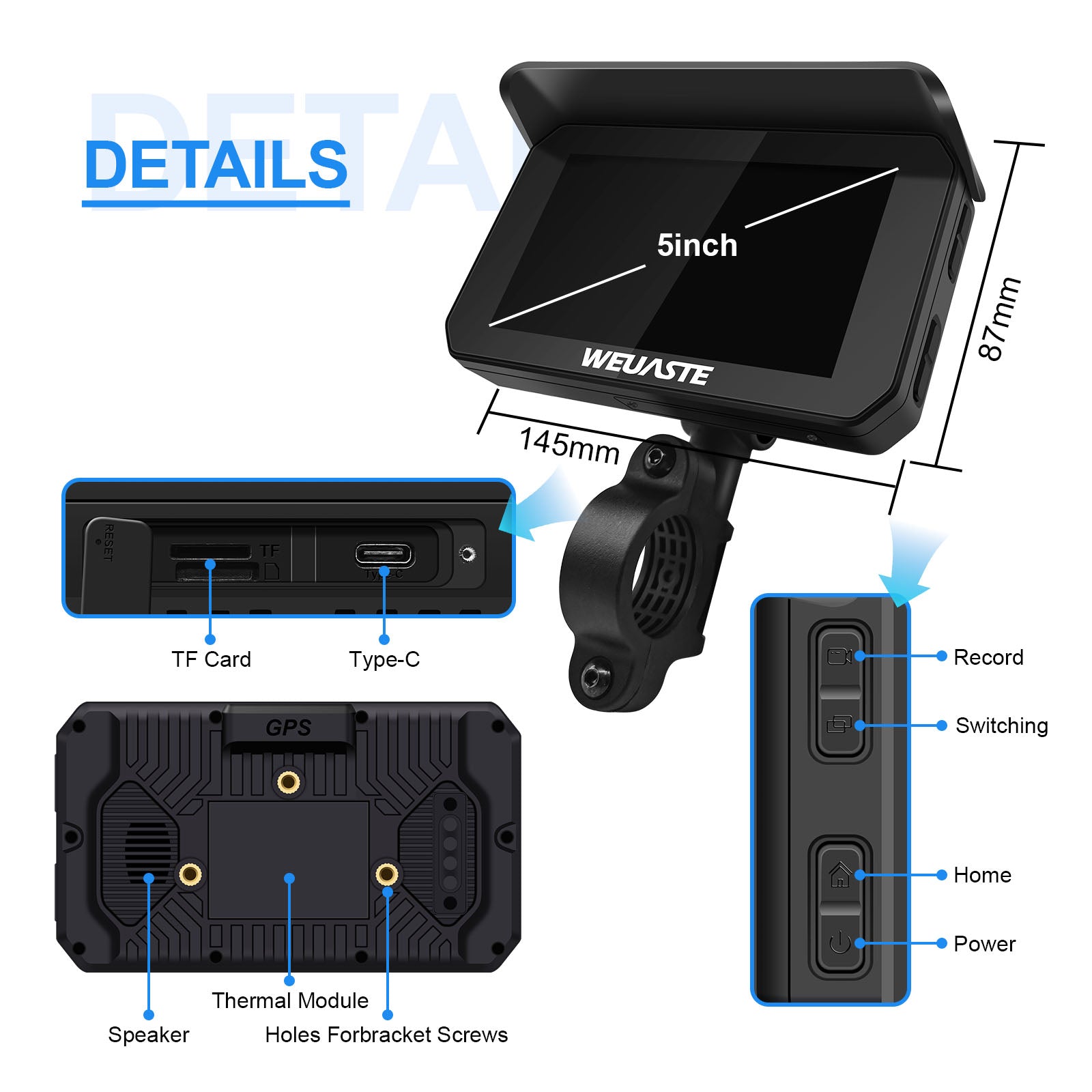 WEUASTE Portable Wireless Apple Carplay for Motorcycle, 1080P Dual Motorcycle Camera (IMX307 chip), Motorbike Dash Cam, Motorbike TPMS, 5" IPS Waterproof Touch Screen, 128 GB TF Card, Support Siri