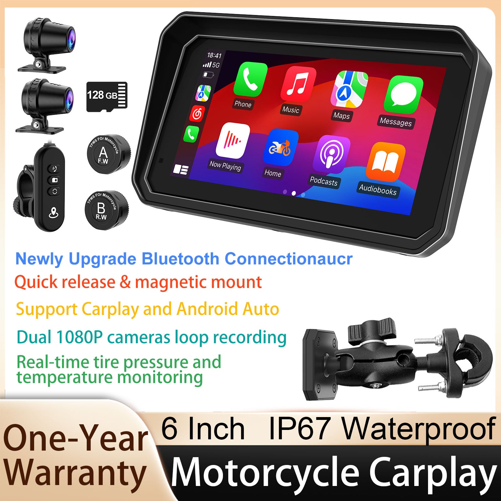 - 【Motorcycle DVR with Dual Cameras】This 6-inch motorcycle CarPlay unit includes front and rear 1080P dashcams that support split-screen display while simultaneously recording your journey. The package includes a 128GB SD card for loop recording and G-sensor functionality. With built-in WiFi, you can view, play, and download footage directly to your smartphone in real time.
