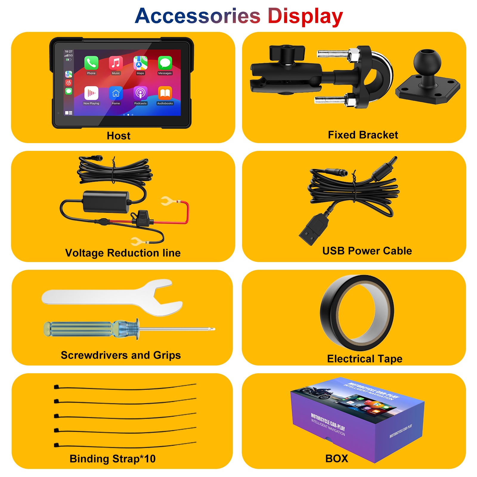Included Components | Weuaste 7 Inch Motorcycle Carplay Screen with Wireless CarPlay & Android Auto |