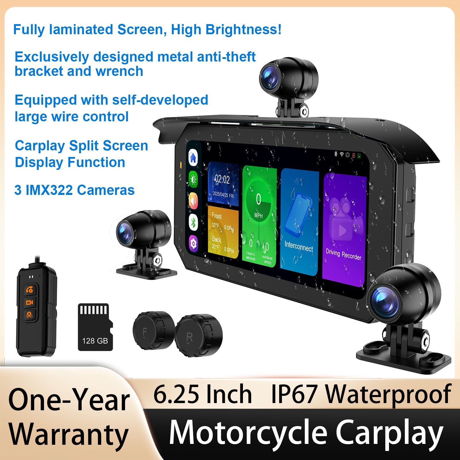 Weuaste MT92C 6.25" Motorcycle Carplay Screen, HD 1080P Dual Dash Cam + First-Person Camera, Moto TPMS, Wireless Car Play/Android Auto/HiCar, Loop Recording, Controller, Metal Anti-Theft Bracket